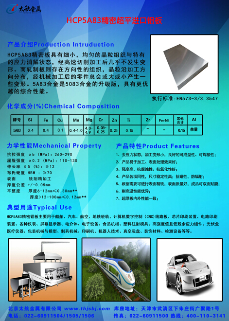 HCP5A83精密鋁板對雜質、堿金屬元素和低熔點元素的嚴格控制提高了合金的耐蝕性和抗蠕變能力,板材兩面經過銑磨加工呈現(xiàn)出超平精細表面,尺寸公差標準全球領先,出廠全檢,可雙面貼膜保護,強度超過歐洲同類產品,厚度規(guī)格覆蓋率高(≥4.5mm)。