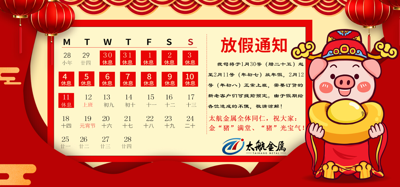 【太航金屬】2019年春節放假通知